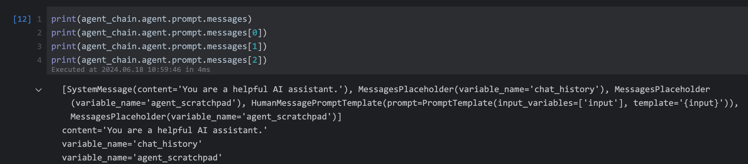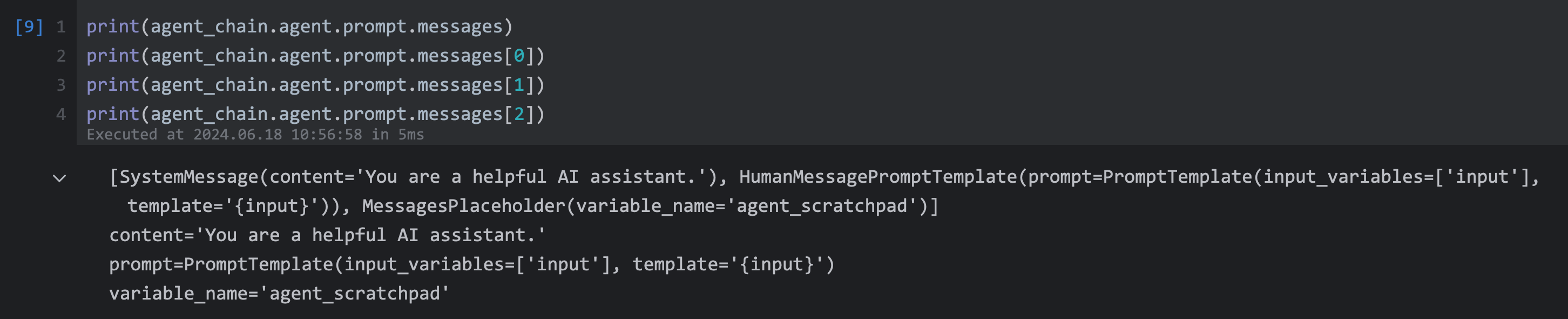 这将输出Agent使用的默认提示词模板。通常包括系统消息、人类消息提示词模板和AI消息模板。
