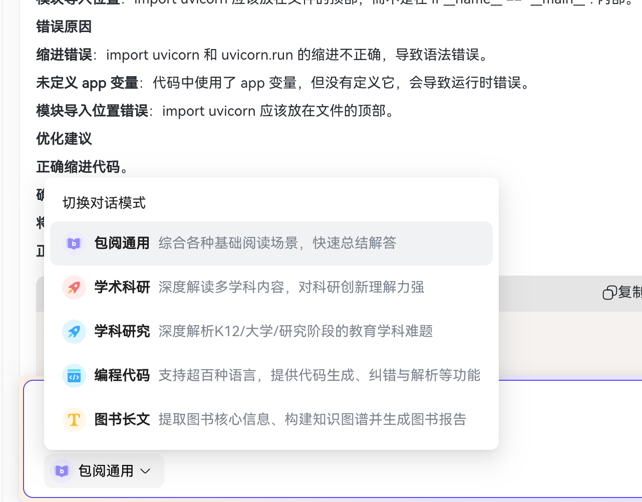 点击直达官网:你能想到的编程工作所需,这都有!从构思到实现,包阅AI都能提供全方位的支持。界面设计简洁直观,操作流畅,即使是非技术背景的用户也能轻松上手。此外,包阅AI的响应速度快,能够即时提供反馈,大大缩短了开发周期。