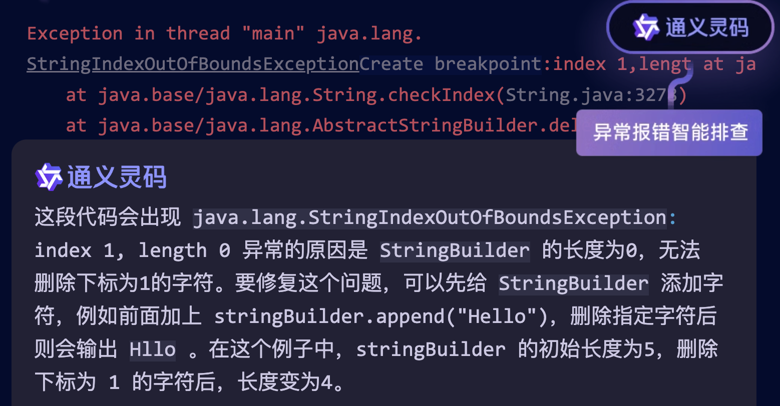 在 IntelliJ IDEA 中,当运行出现异常报错时,在运行标准输出窗口中,即可看到通义灵码的快捷操作按钮,单击后,通义灵码将结合运行代码、异常堆栈等报错上下文,快速给出排查思路或修复建议。
