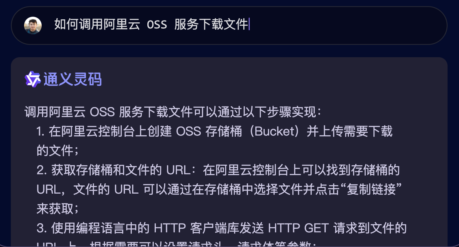 基于海量研发文档、产品文档、通用研发知识、阿里云的云服务文档和 SDK/OpenAPI 文档等进行问答训练,为你答疑解惑,轻松解决研发问题。遇到编码疑问、技术难题时,一键唤起通义灵码,无需离开 IDE 客户端,即可快速获得答案和解决思路。聚焦研发领域知识的问答,帮助开发者快速解决问题。