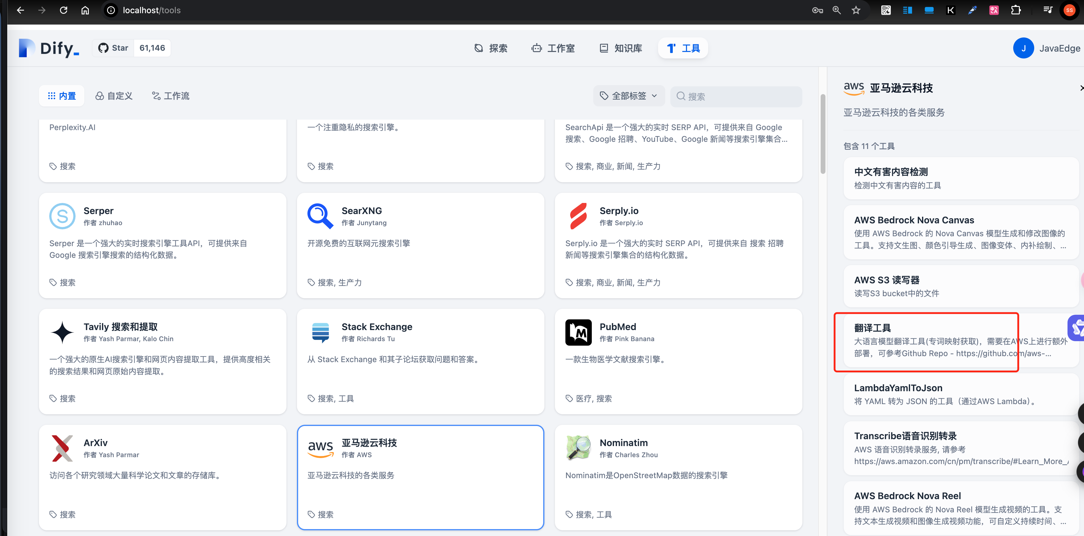 若安装成功,可在 dify 首页的 Tools Tab 中看到新增的工具集: