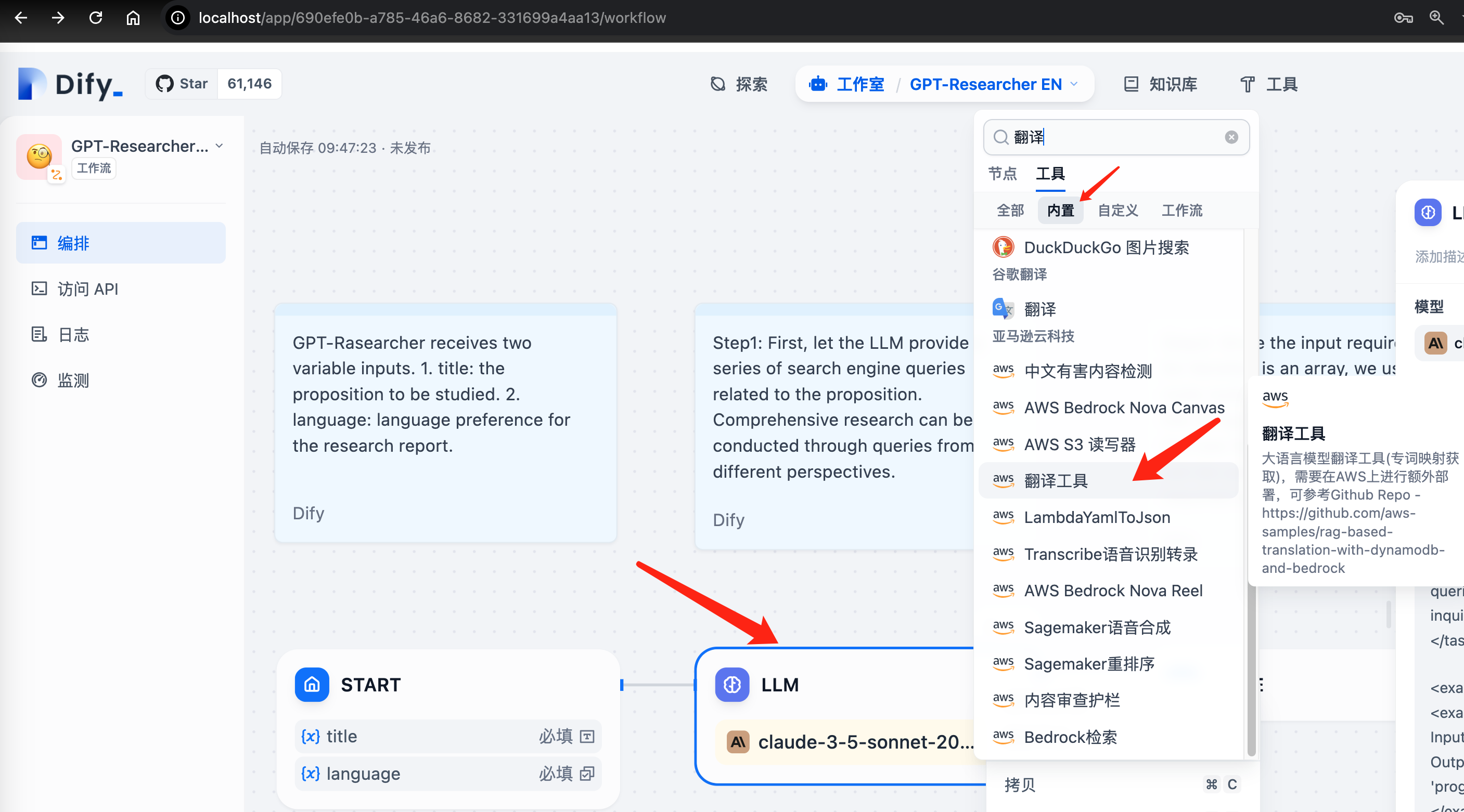 参考栏中的一文中介绍了专词翻译的方案,其中借助分词器进行专词提取和 KV 数据库存贮映射关系,方案中包含的 DynamoDB & Glue 服务,其服务能力是目前 Dify 所不具备的,单纯依靠 Dify 无法支持这种翻译诉求。