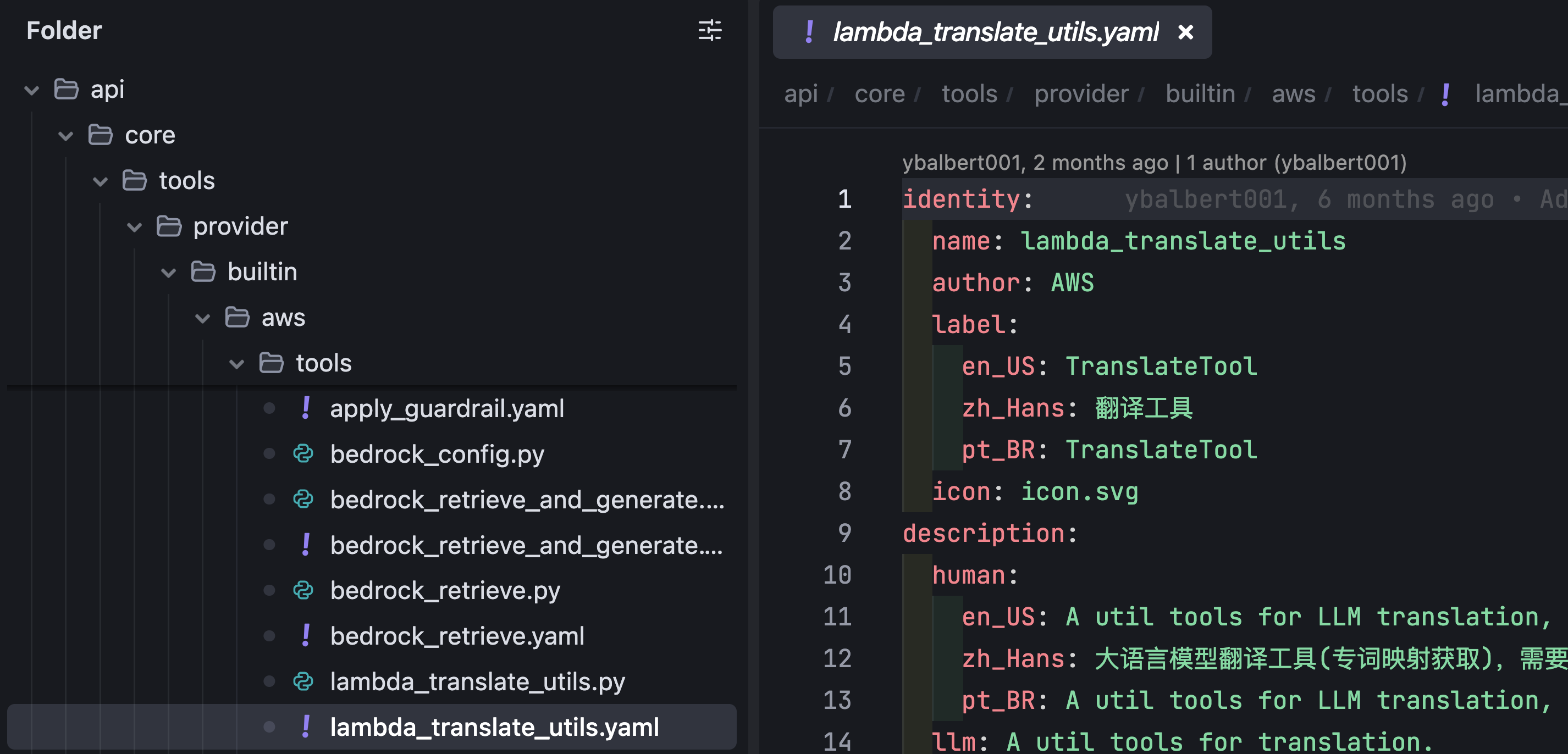 参考Dify文档定义工具,一个工具一般对应两个文件: