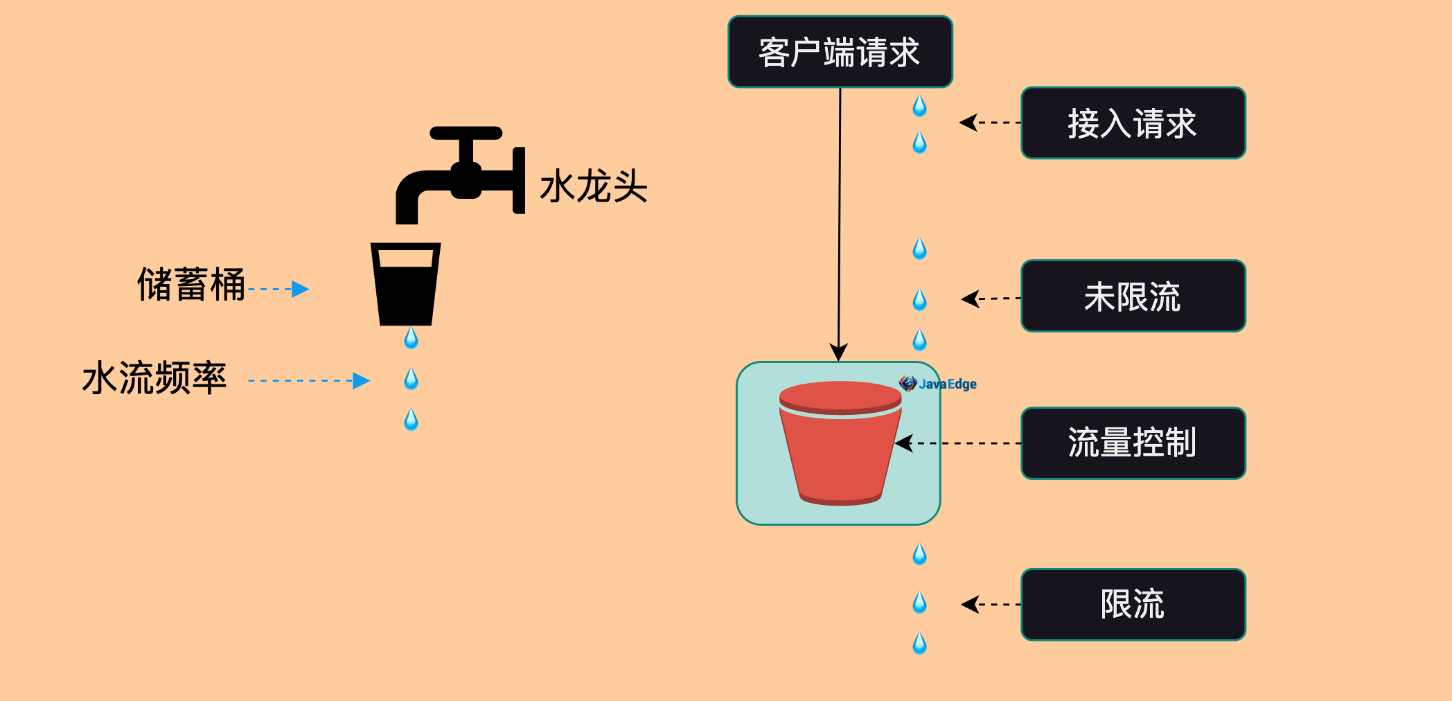若流入水滴超出桶容量,则流入的水滴溢出(被丢弃),而漏桶容量不变。