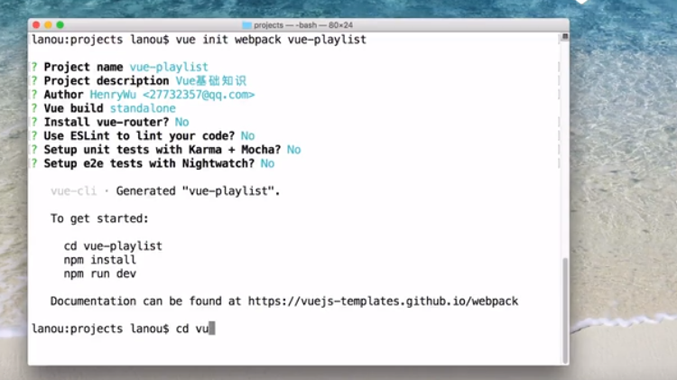 在用 Vue 构建大型应用时推荐使用 NPM 安装[1]。NPM 能很好地和诸如 webpack 或 Browserify 模块打包器配合使用。同时 Vue 也提供配套工具来开发单文件组件。
